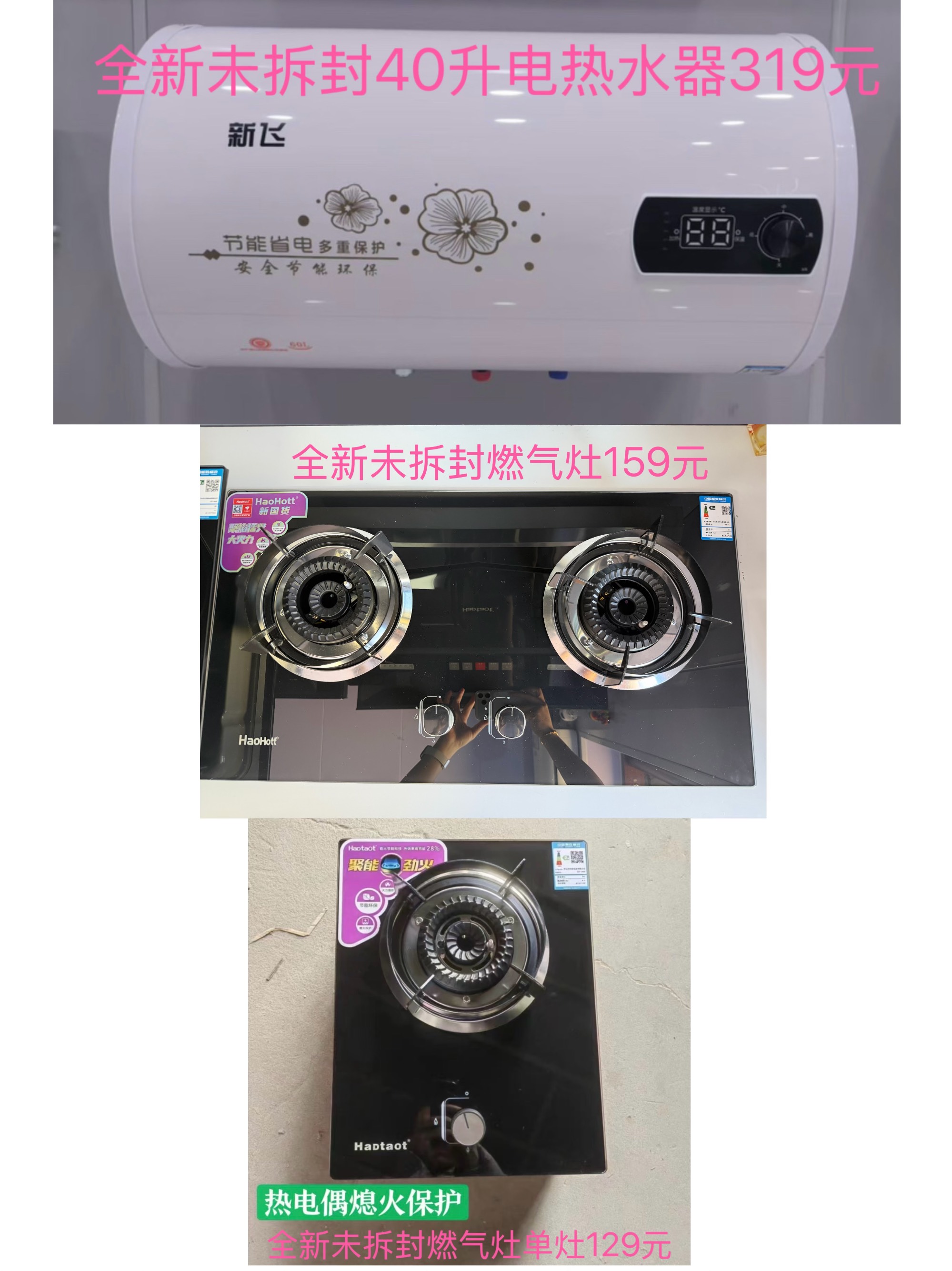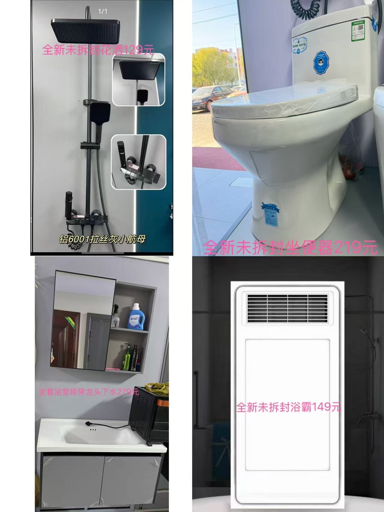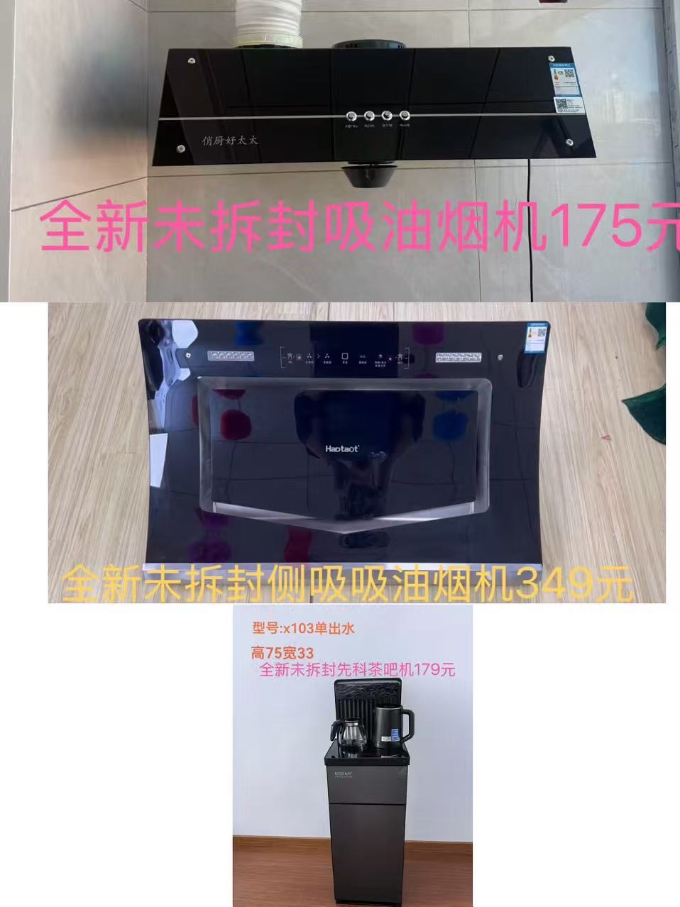 全新:热水器319,燃气灶159,单灶129,吸油烟机175,侧吸烟机349,茶吧机179,浴霸149,花洒129,坐便219,浴室柜279