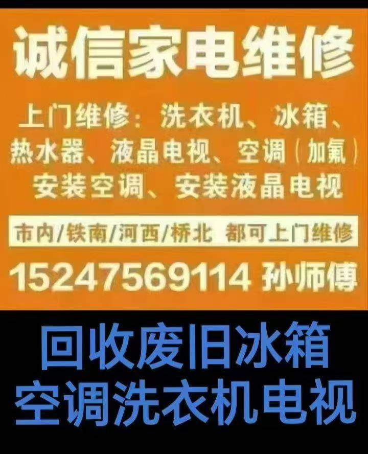 诚信家电维修,上门维修洗衣机,冰箱,热水器,液晶电视,冰柜,空调,保鲜柜,太阳能热水器,饮水机,微波炉,安装液晶电视(挂架)安装空调(拆装,加氟),维修饭店厨房制冷设备,桥北,河西,铁南都可上门维修!联系电话:15247569114,孙师傅15647510446…清洗家电。清洗洗衣机,热水器,油烟机,空调。